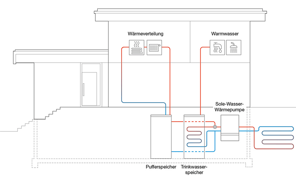Die Funktionsweise eines Pufferspeichers ist unkompliziert. Zunächst entnimmt die Wärmepumpe der Umwelt Wärme, bringt diese auf ein höheres Niveau und überträgt sie anschließend auf den Heizkreislauf.